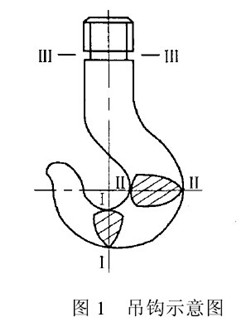吊鉤是江陰凱澄電動葫蘆重要的取物裝置,國內(nèi)起重機吊鉤(75t以下)使用多的是鍛鉤。根據(jù)吊鉤結(jié)構(gòu)和受力狀況,一般認為存在如圖1所示的三個Ⅰ-ⅠⅡ-Ⅱ和Ⅲ-Ⅲ危險截面。文獻認為Ⅱ-Ⅱ截面是吊鉤易發(fā)生疲勞變形或斷裂的危險截面。但從檢驗角度上看,Ⅲ-Ⅲ斷面處于橫截面突然變小的鉤頸退刀槽處,它是鉤尾軸部分承受拉應(yīng)力大、強度弱的截面。