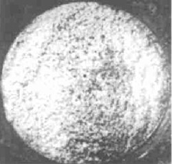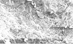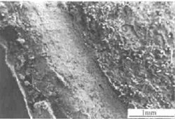 采用日本產(chǎn)的JSM-6300型掃描電子顯微鏡對斷口微觀特征進行分析(以下電鏡照片左下角為外壁方向,右上角為徑向,即裂紋擴展方向)。如圖3所示,整個斷面較為平整,但在斷裂邊緣處有一近似45b的斜斷面,寬約1mm,從圖中可看到新舊斷口全貌,中部舊裂紋是在使用過程中由于低周疲勞所形成的,右邊新斷口是瞬斷而形成的。