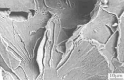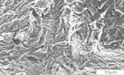 圖5為疲勞條紋形態(tài),其條紋主要為韌性條帶,此時條帶相對較窄而當裂紋進一步擴展時裂紋條帶逐漸變寬,從圖中還可以看到疲勞裂紋條帶較為粗大,二次裂紋非常多,即破壞已相當嚴重。此時已預(yù)示著吊鉤的壽命快到盡頭了。
